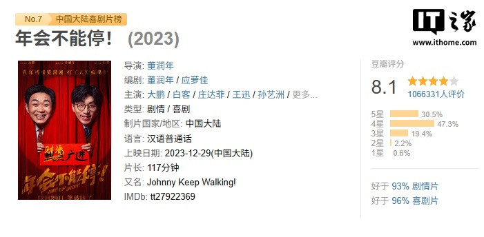 《年会不能停!》首部电影于2023年12月29日上映,累计票房达到了12.92亿元。该喜剧电影在豆瓣的评分为8.1分,其中30.5%的用户给出了五星评价、47.3%的用户给出了四星评价,仅有0.6%的用户给出一星评价。