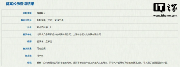 IT之家9月5日消息,据国家电影局最新立项公示显示,电影《年会不能停!2》备案立项,编剧依旧是董润年、应萝佳。